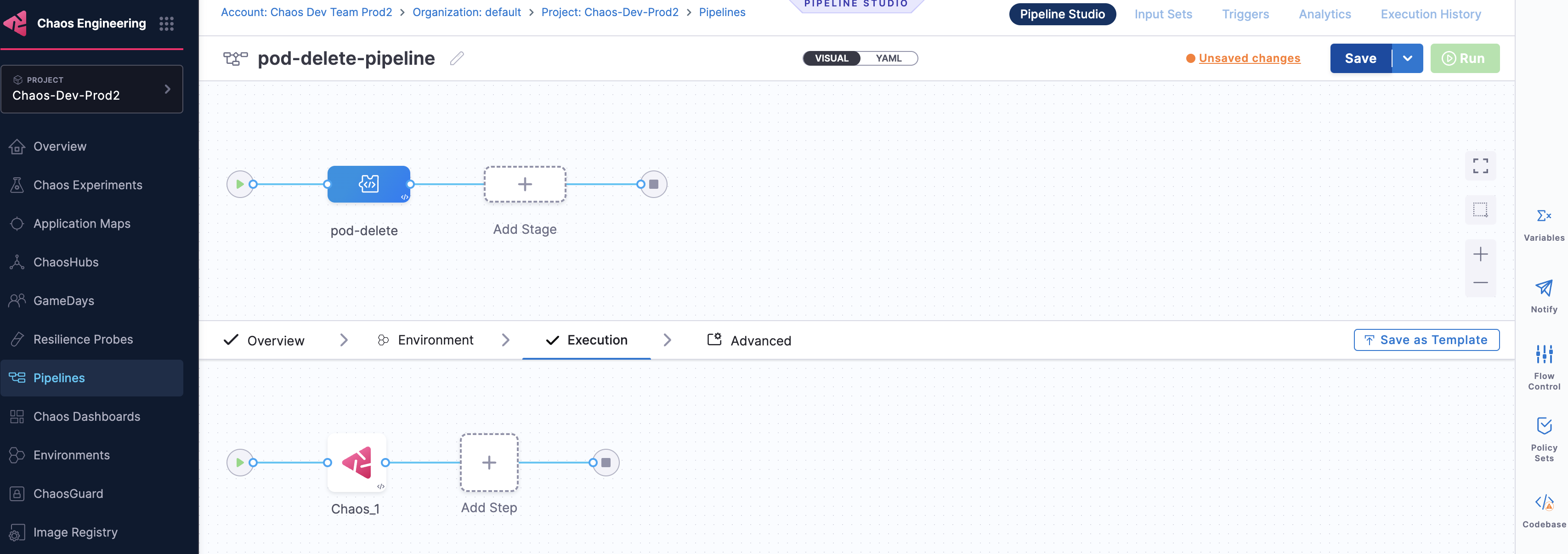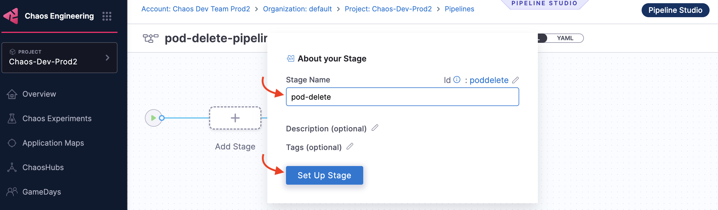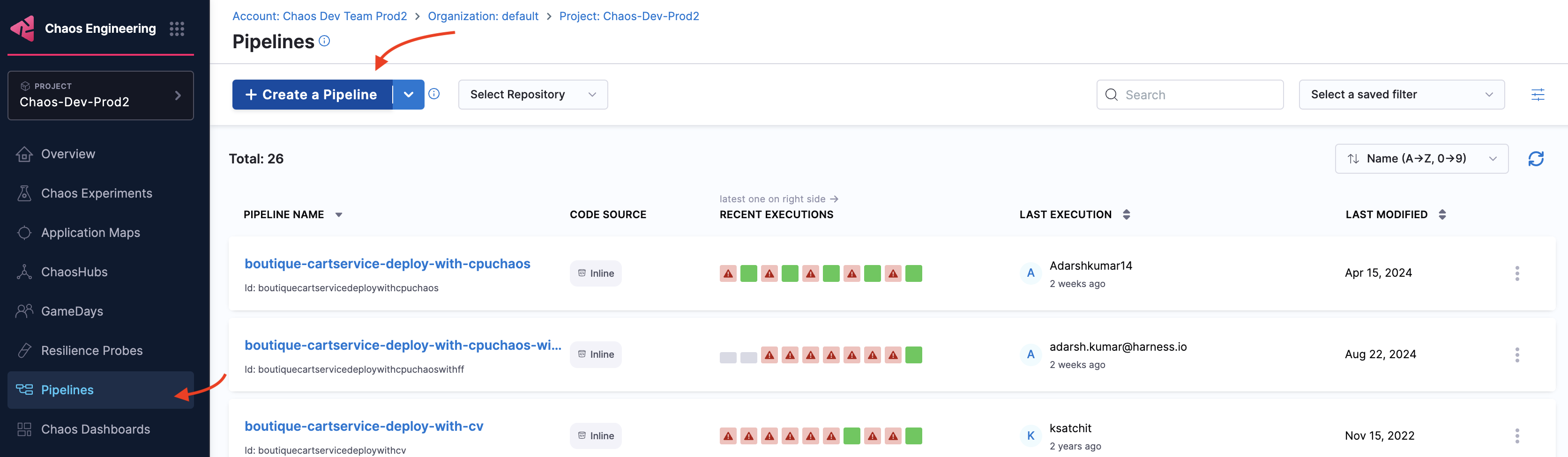 Go to Chaos module and select Pipelines and click +Create a Pipeline.