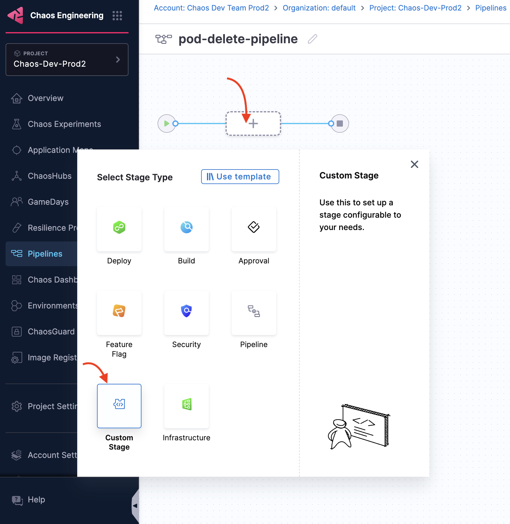 Choose from the list of chaos experiments, and click Add to Pipeline.