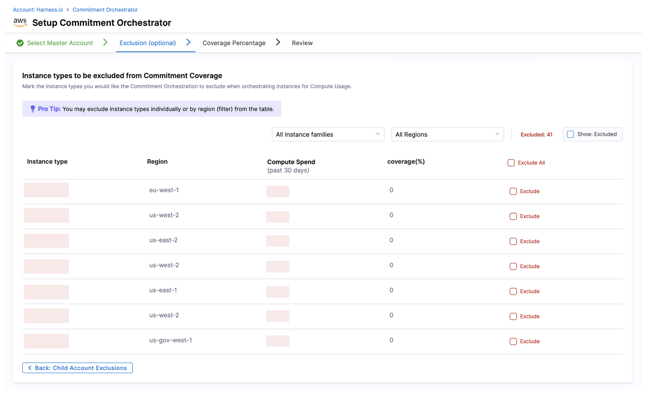 Commitment Orchestrator provides you with an option to choose the child accounts and instances you would like to exclude when orchestrating for Compute Usage.