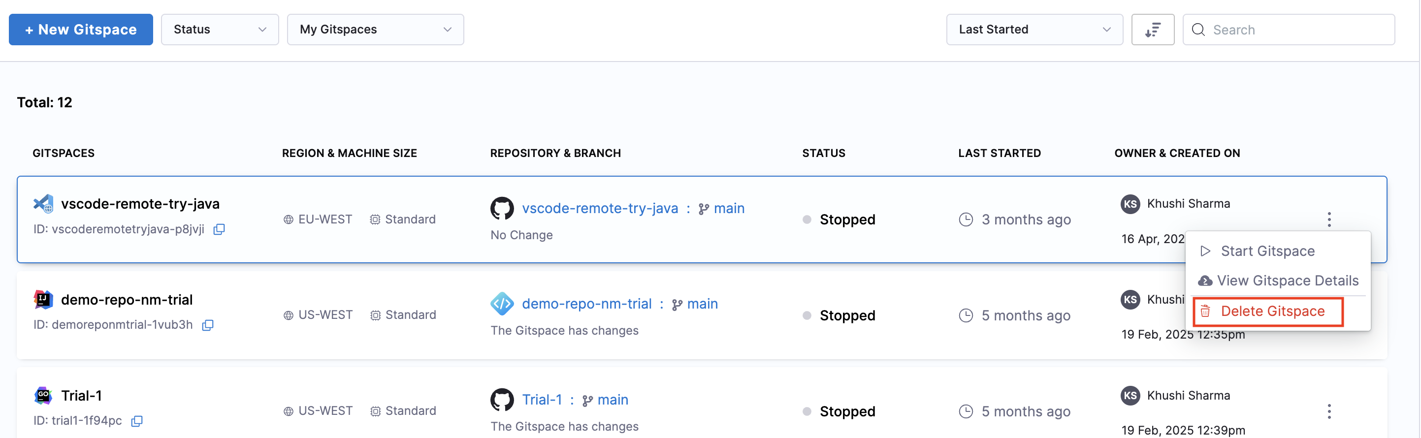 There are 2 ways to delete an existing Gitspace: