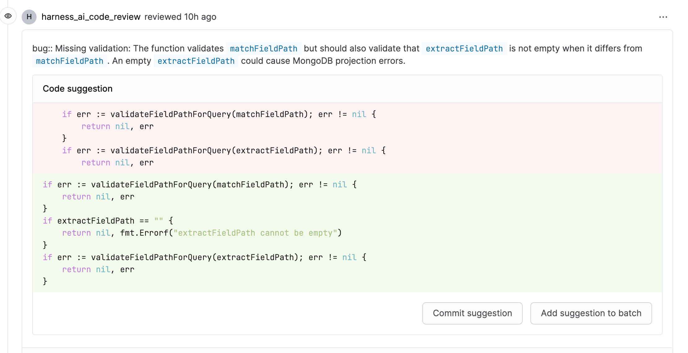 The following example shows an AI-generated review comment with a suggested fix: