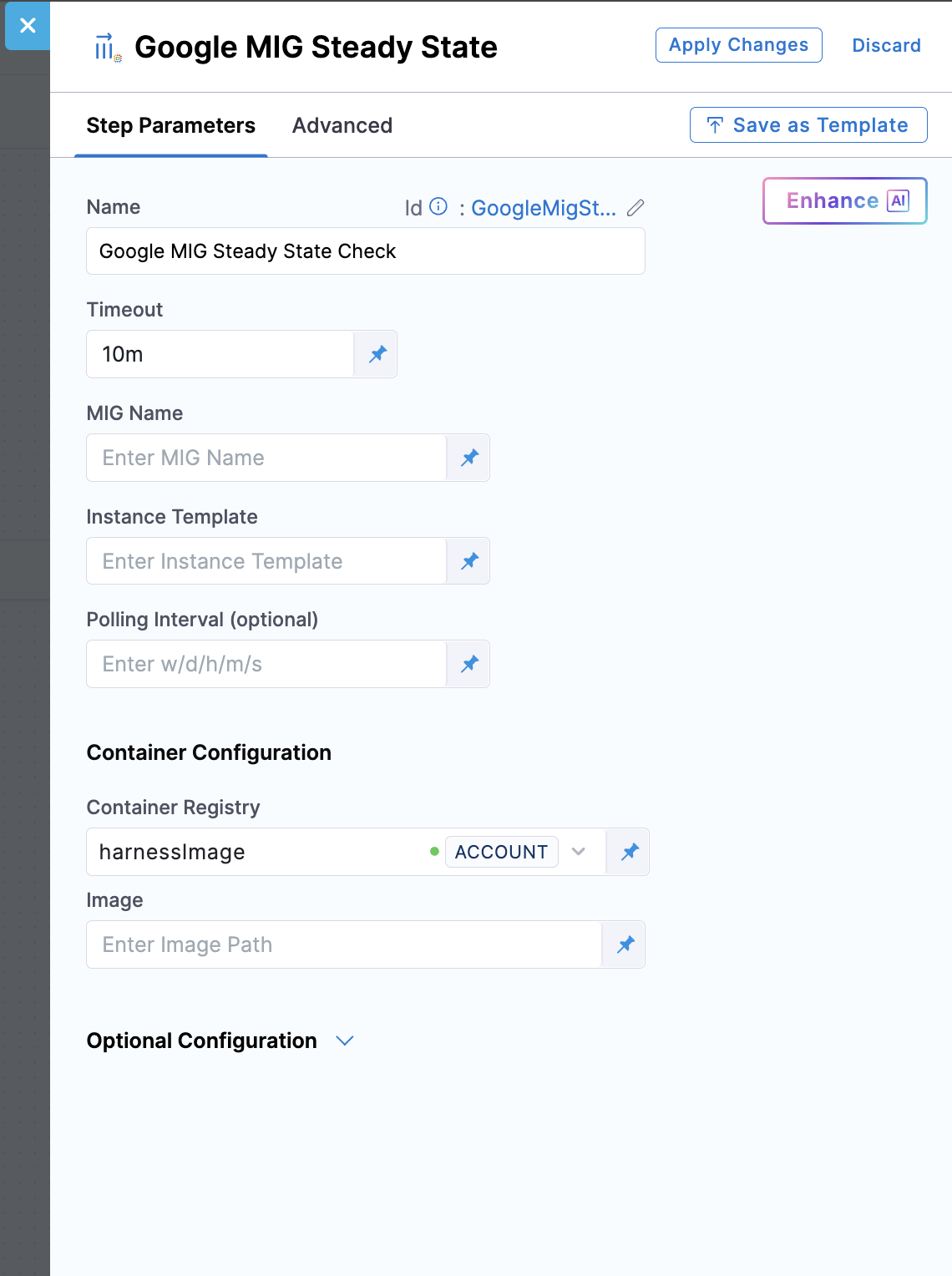 This step checks the steady state of the MIG specified in its configuration. You should configure this step to check the newly created MIG (the one labeled stage), since it's not currently handling traffic. Harness verifies that the specified MIG has reached a stable, healthy state before proceeding with traffic shifting.