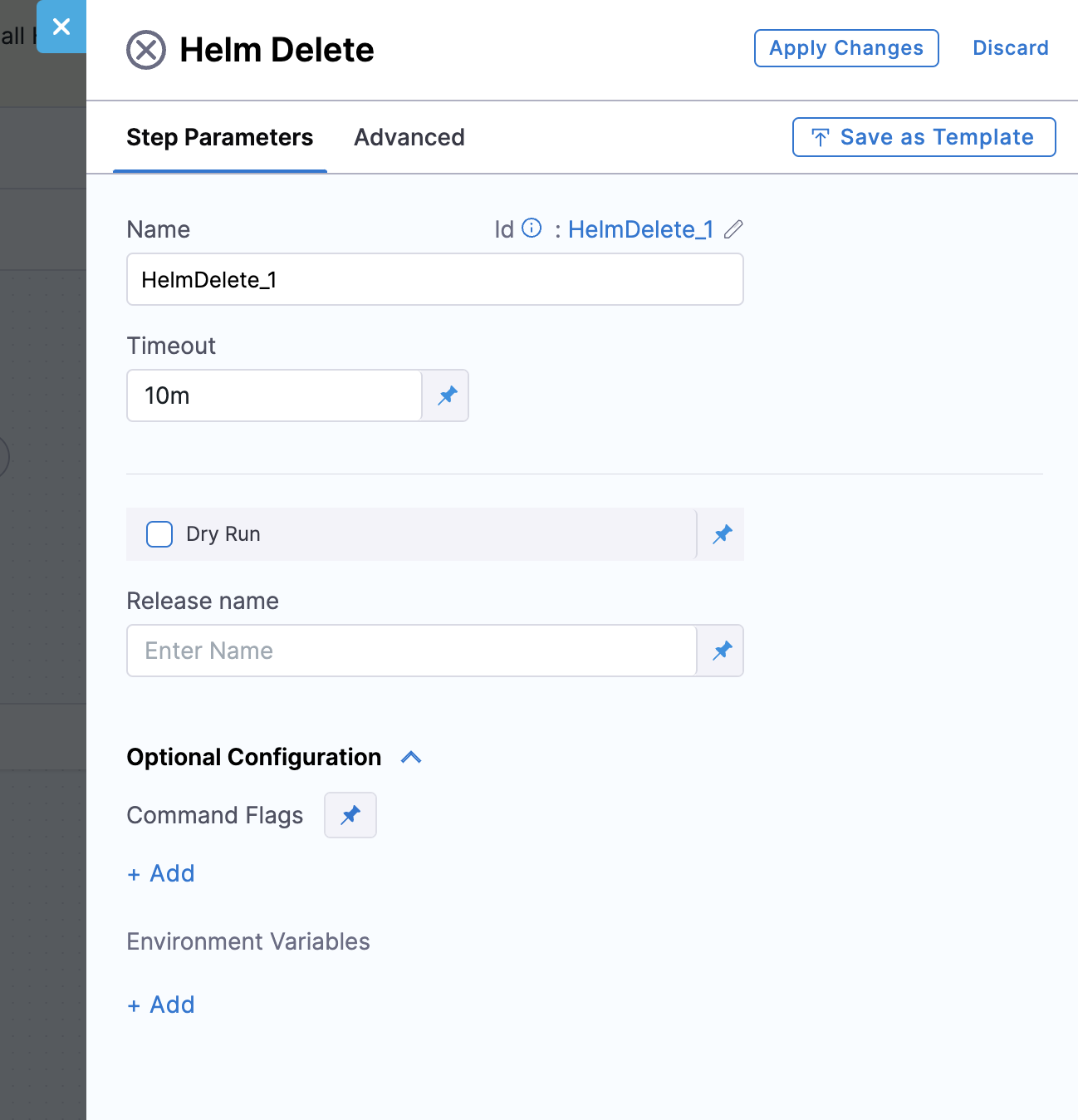 Command Flags: Users can add or remove Helm flags as needed within the step configuration. For a complete list of supported command flags, refer to the Helm Documentation.