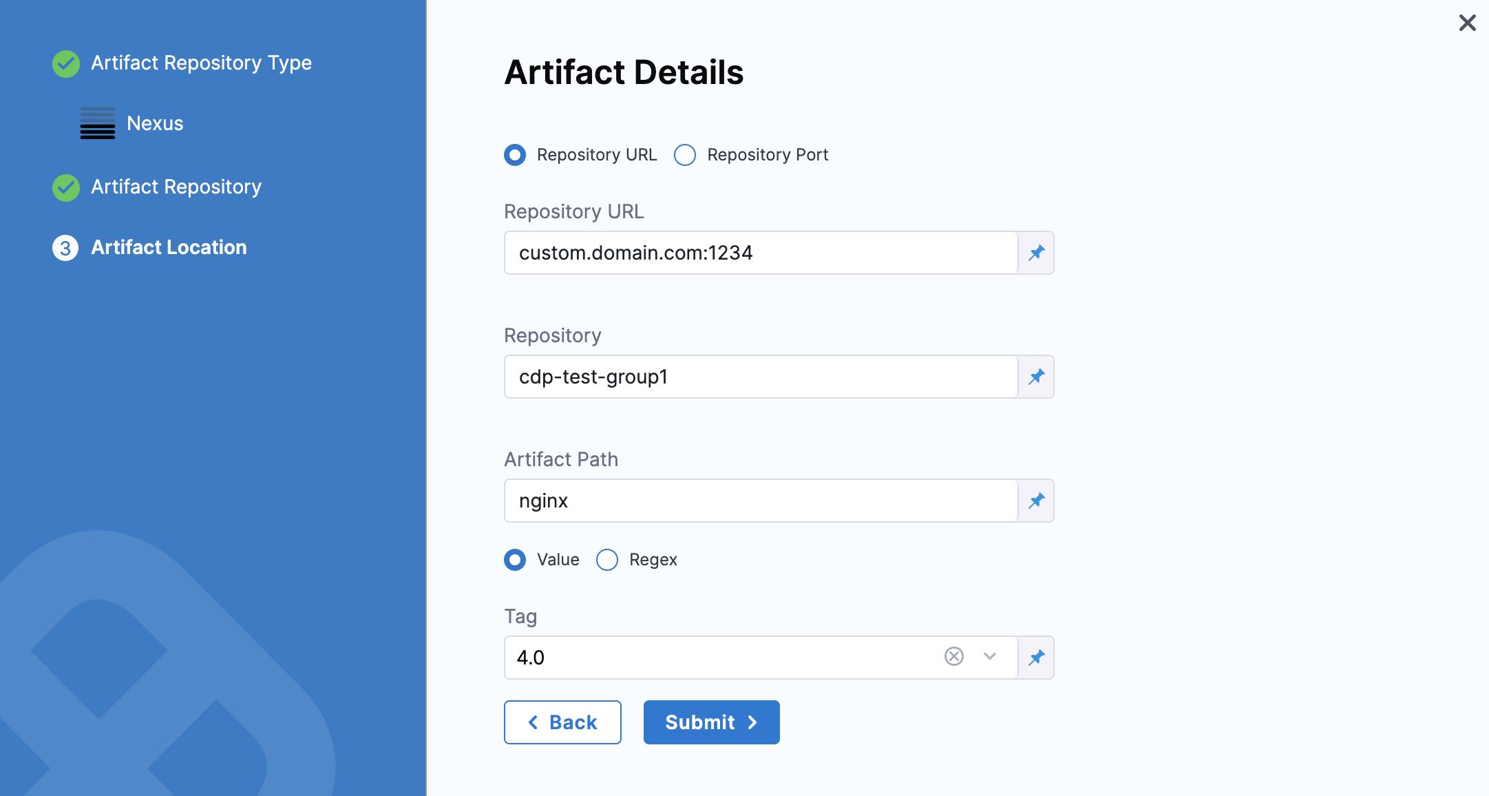https://registry.hub.docker.com/v2/. To connect to a private Docker registry, usehttps://index.docker.io/v2/.Click Continue. - In Image path, enter the name of the artifact you want to deploy, such as library/nginx.