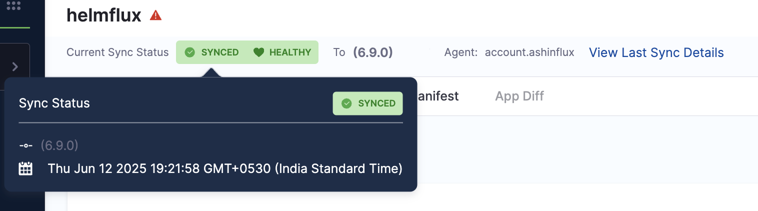 The Health and Sync status indicators now include extended metadata in a popover. Hovering over a status reveals additional context such as sync type, revision, and more. This allows you to quickly assess the application state without leaving the dashboard.
