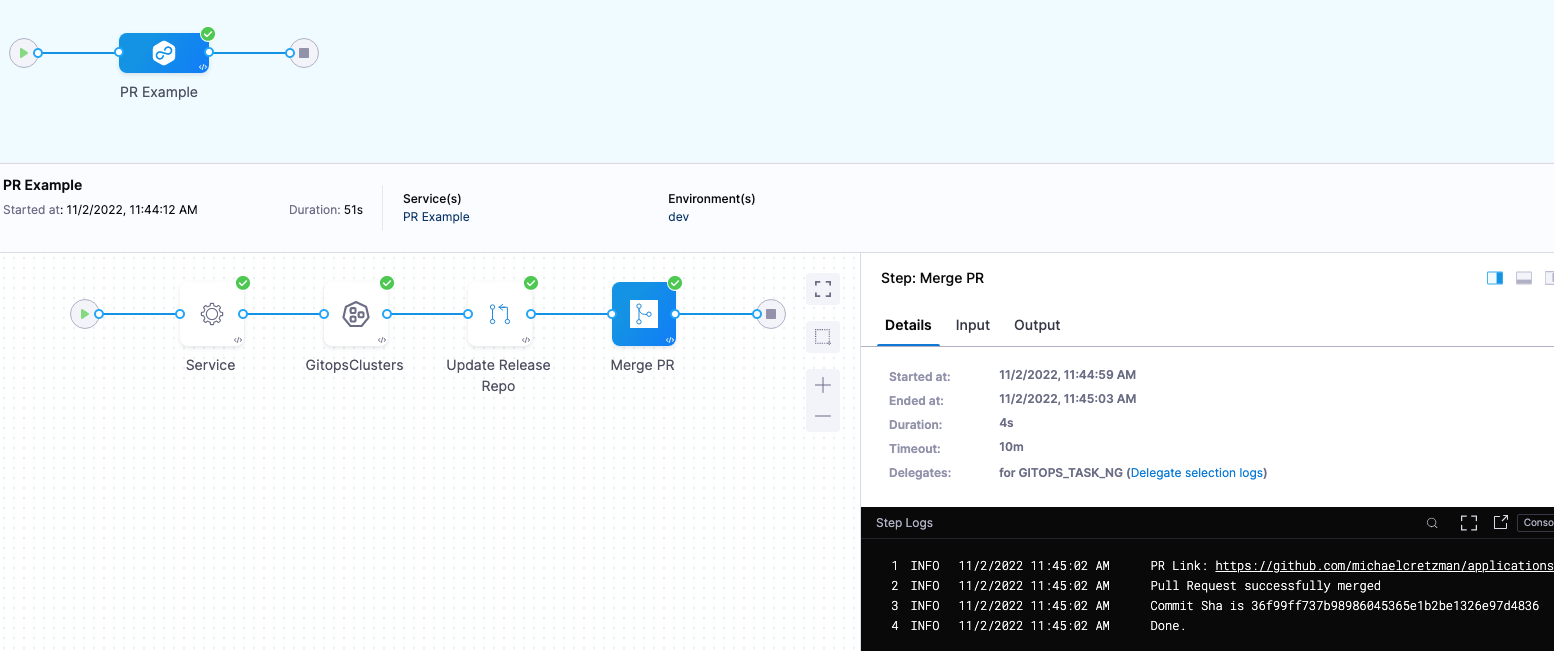 Harness automatically adds the Update Release Repo, Merge PR and Fetch Linked Apps Steps, which are ready to be run without any configuration. However, to further customize these steps or add other optional steps, please refer to Harness GitOps pipeline steps.