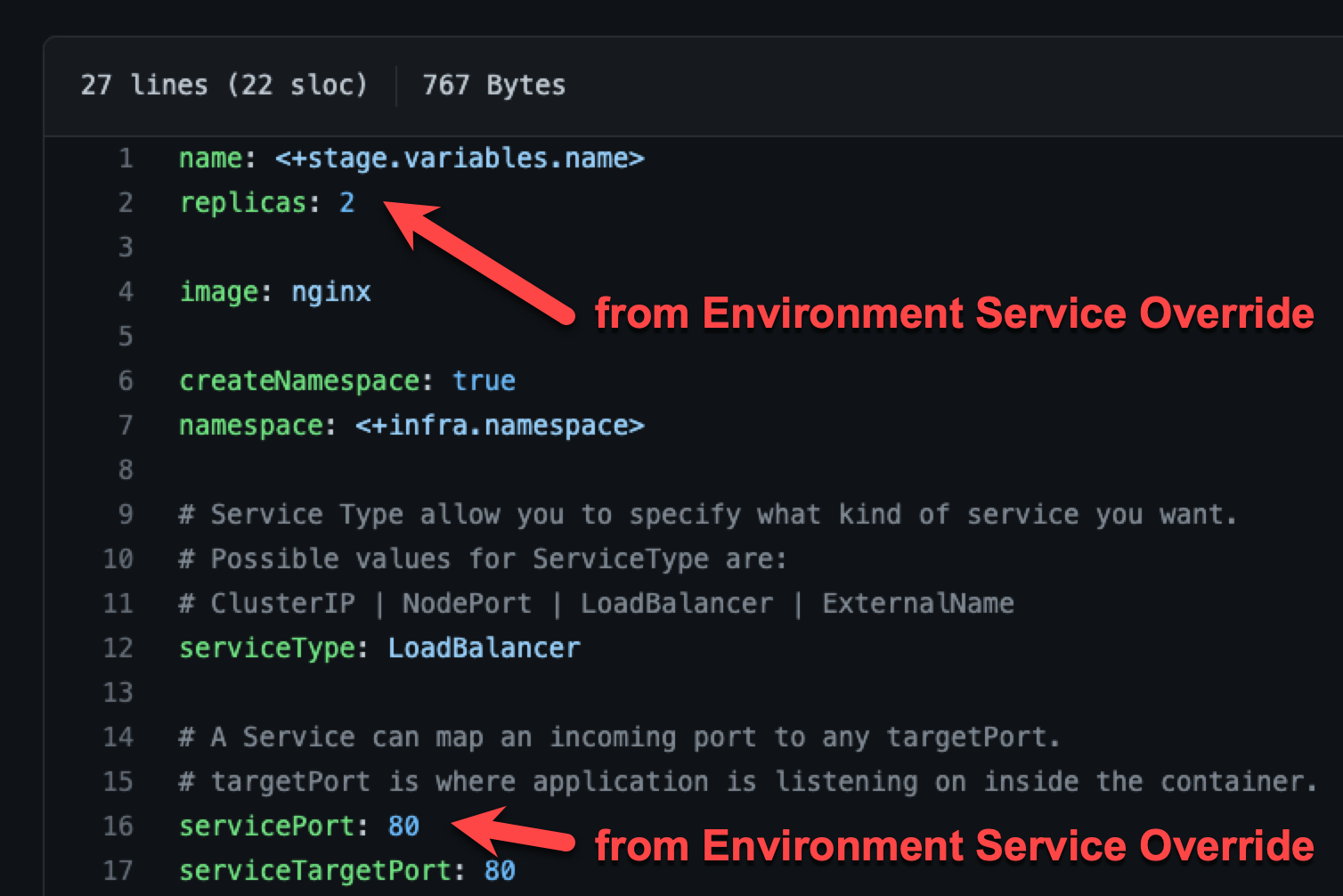 At runtime, the name:value pairs from the environment Service Overrides values YAML fully override the service values YAML. The replicas: 2 and servicePort: 80 from the environment Service Overrides are used.