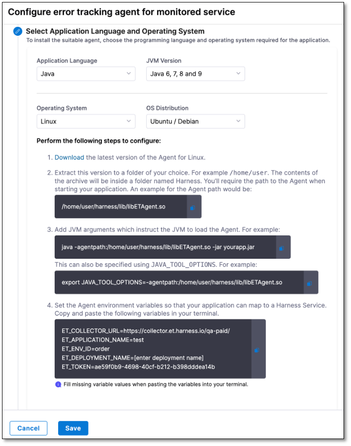 Use the instructions on the Configure error tracking agent for monitored service page to download the Agent, add JVM arguments, and set environment variables.