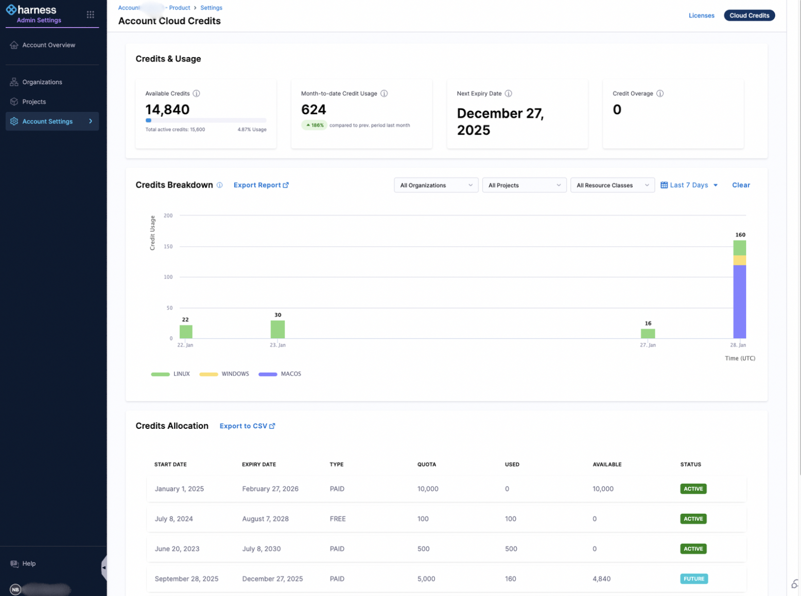 - Viewing Harness Cloud build credit usage data.