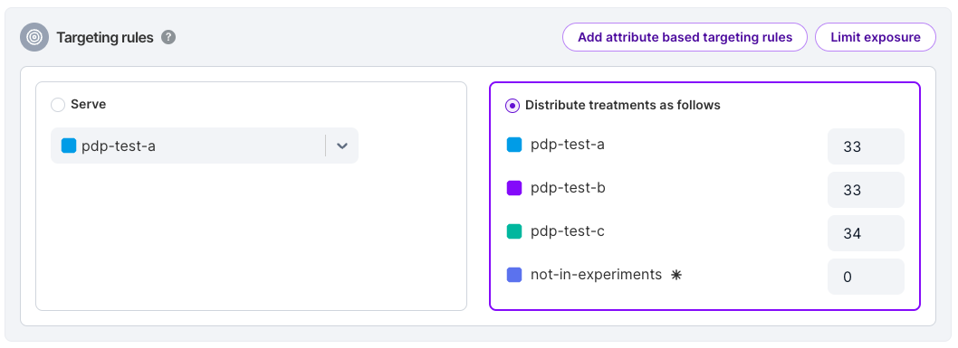 In the Targeting section, in Targeting rules, select Distribute treatments as follows. Allocate the following user traffic percentages: