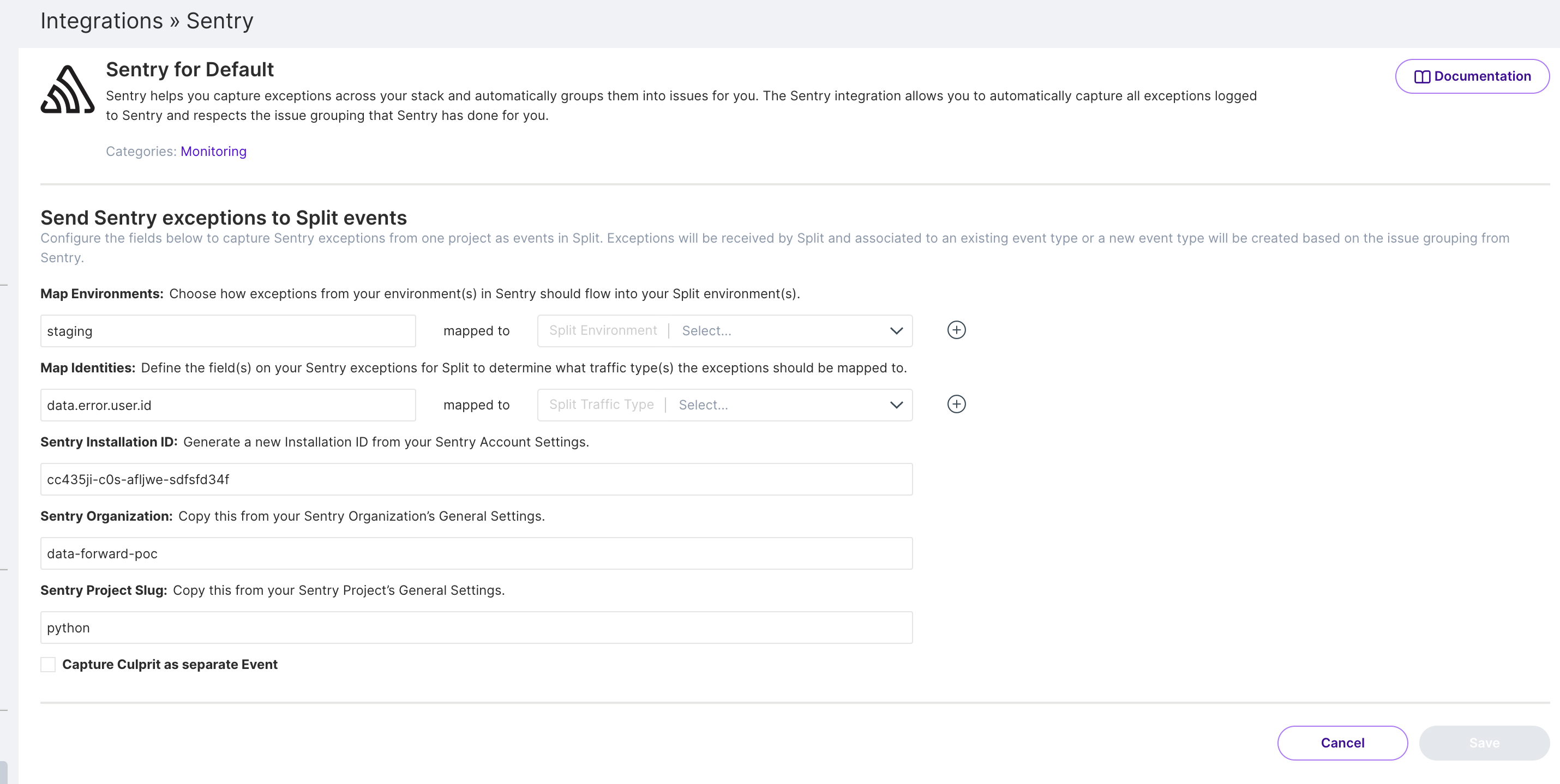 The left side of the mapping(s) are text fields where you should enter in the exact key and path in your Sentry exceptions for your keys as you use them in your Sentry implementation when you log it in your code. For example, if you had used the exact syntax shown in the linked Sentry article in your code, you would want to type "data.erroruser.id" into this field in Harness FME. For more context, take a look through the example data mappings below as well as Sentry's example webhook errors here.