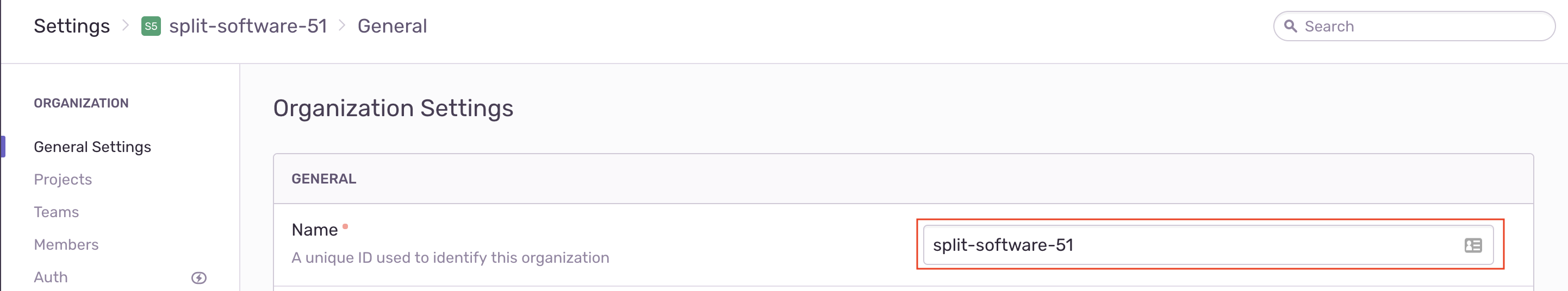 Copy your Sentry Organization Name. You can access this by clicking Settings in the left nav of your Sentry dashboard then clicking General Settings under the Organization section.