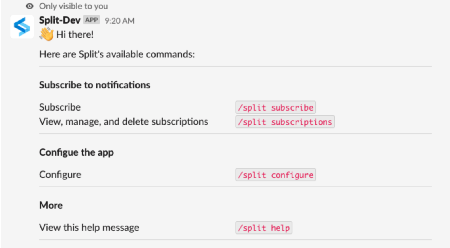 With this integration, as a Slack user, you can subscribe channels to notifications based on filters that they set. Once these filters are set up by that user, any Slack user in that channel can see any event that exists that meets the filter criteria in that channel. In addition, you can see notifications relevant to you, specifically in the Split Slack App on the messages tab.