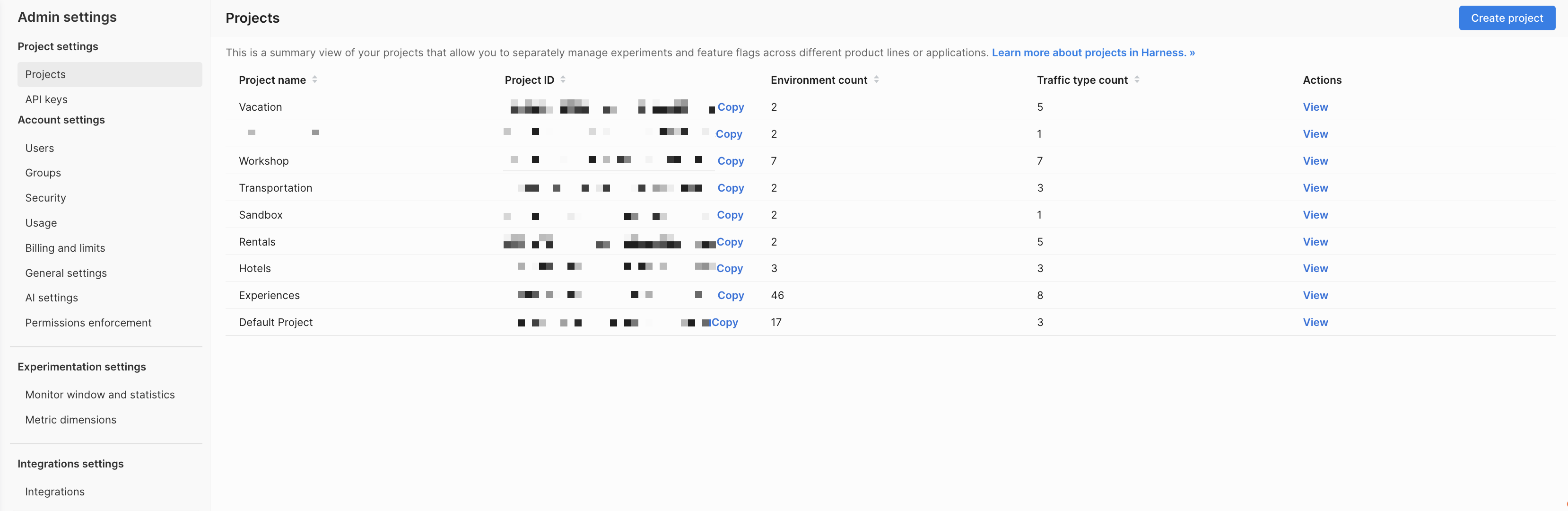 Projects allow you to separately manage your feature flags and experiments across your different business units, product lines, and applications. When you first create your account, you're provided with one project named Default.