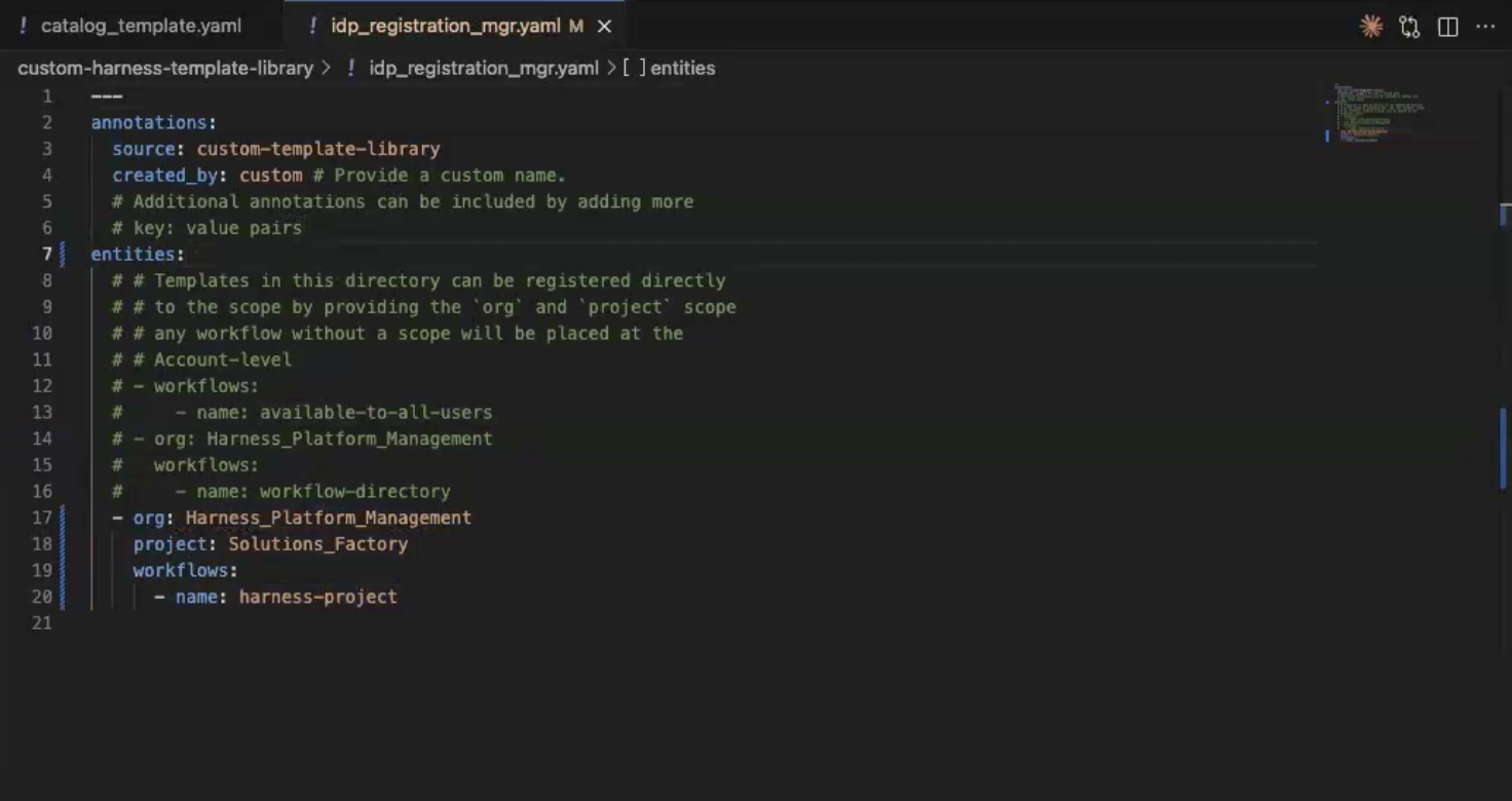 custom-harness-template-library/harness-project/.harnessgo intocatalog_template.yamland find the propertiestemplate_library_connectorandtemplate_library_repoand paste in the Ids from above after “variable.account.” It should look like this: