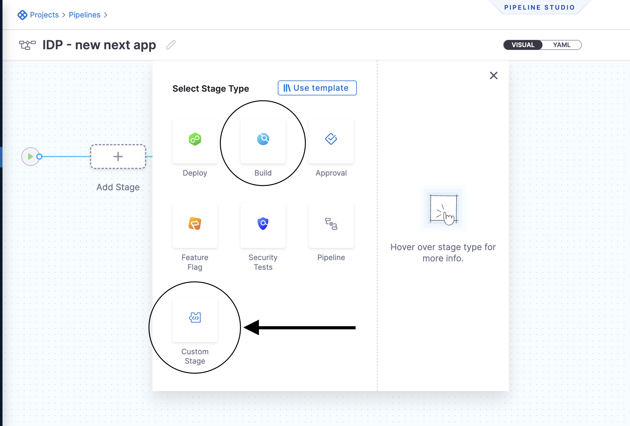 - In Select Stage Type, select Custom Stage. (If you have a Harness CI license, you could also use the Build stage type. However, for this tutorial, we recommend that you use the Custom Stage type.)