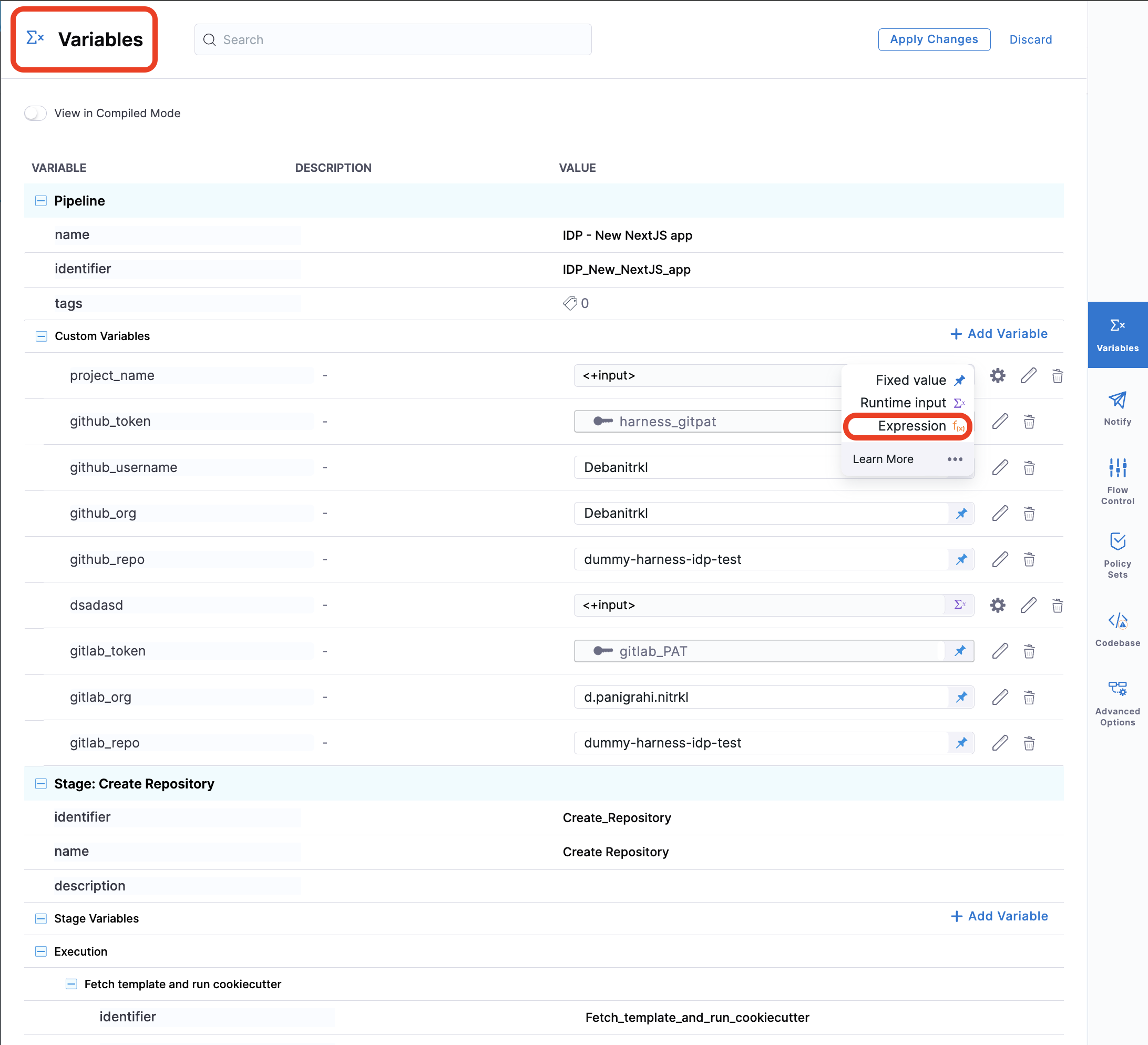 You can create any number of pipeline variables and decide their value type. Some variables, such as a GitHub token, a username, and organization, can have a fixed value. The token used in the code above is a Harness secret whose value is decoded during pipeline execution.