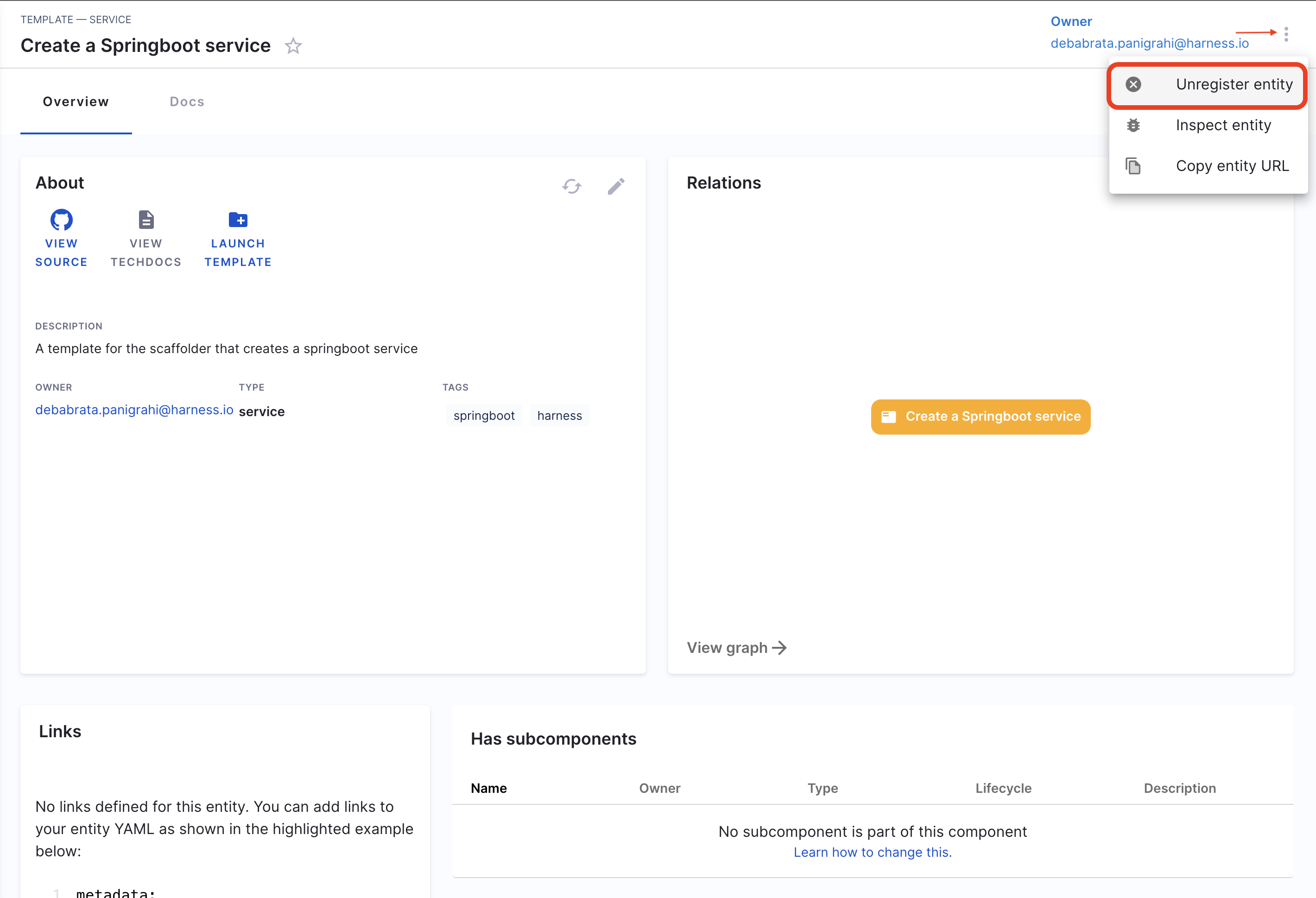 - Now on the Workflow overview page, click on the 3 dots on top right corner and select Unregister Entity.