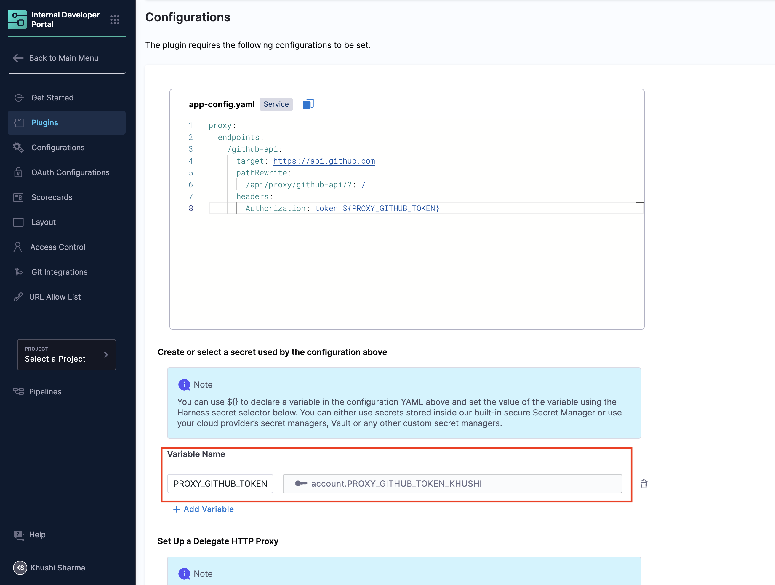 - A GitHub token is stored as a secret in Harness IDP for API authentication. You can add the token as a secret directly while creating a Backend Proxy.