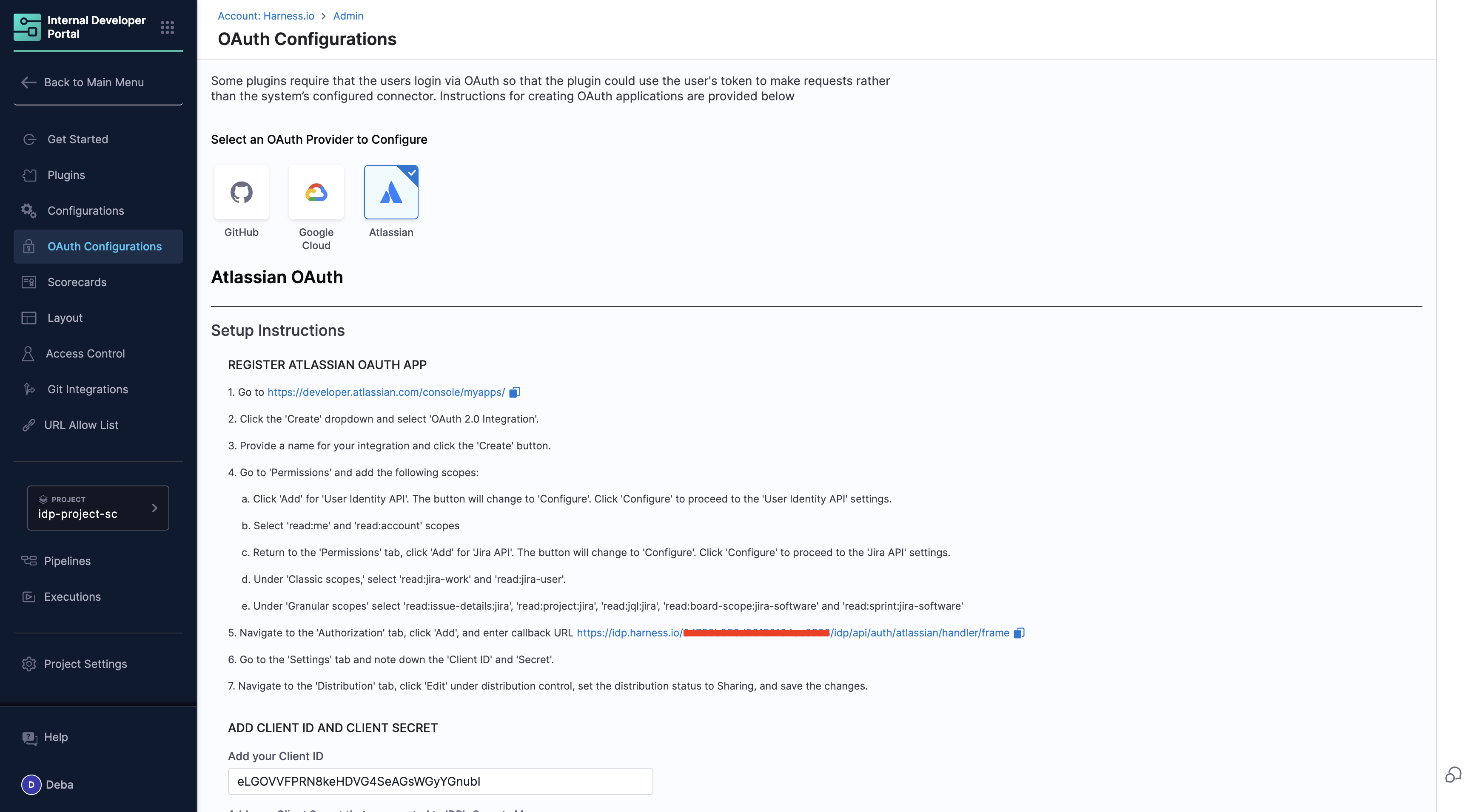 How to Set Up: Access to this JIRA card is authenticated via OAuth Configurations in IDP. To populate your task list, you need to add your Atlassian OAuth App client secret and ID in the configurations page, then developers can login from the homepage.
