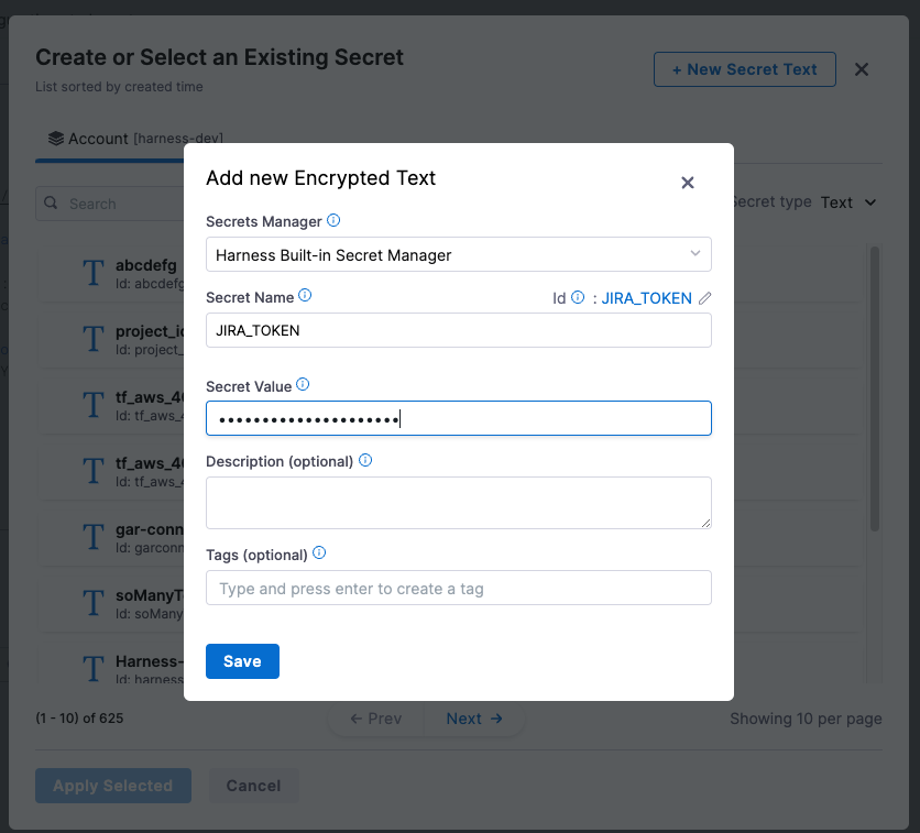 JIRA_TOKENand you will see a pop-up to create or chose existing secret