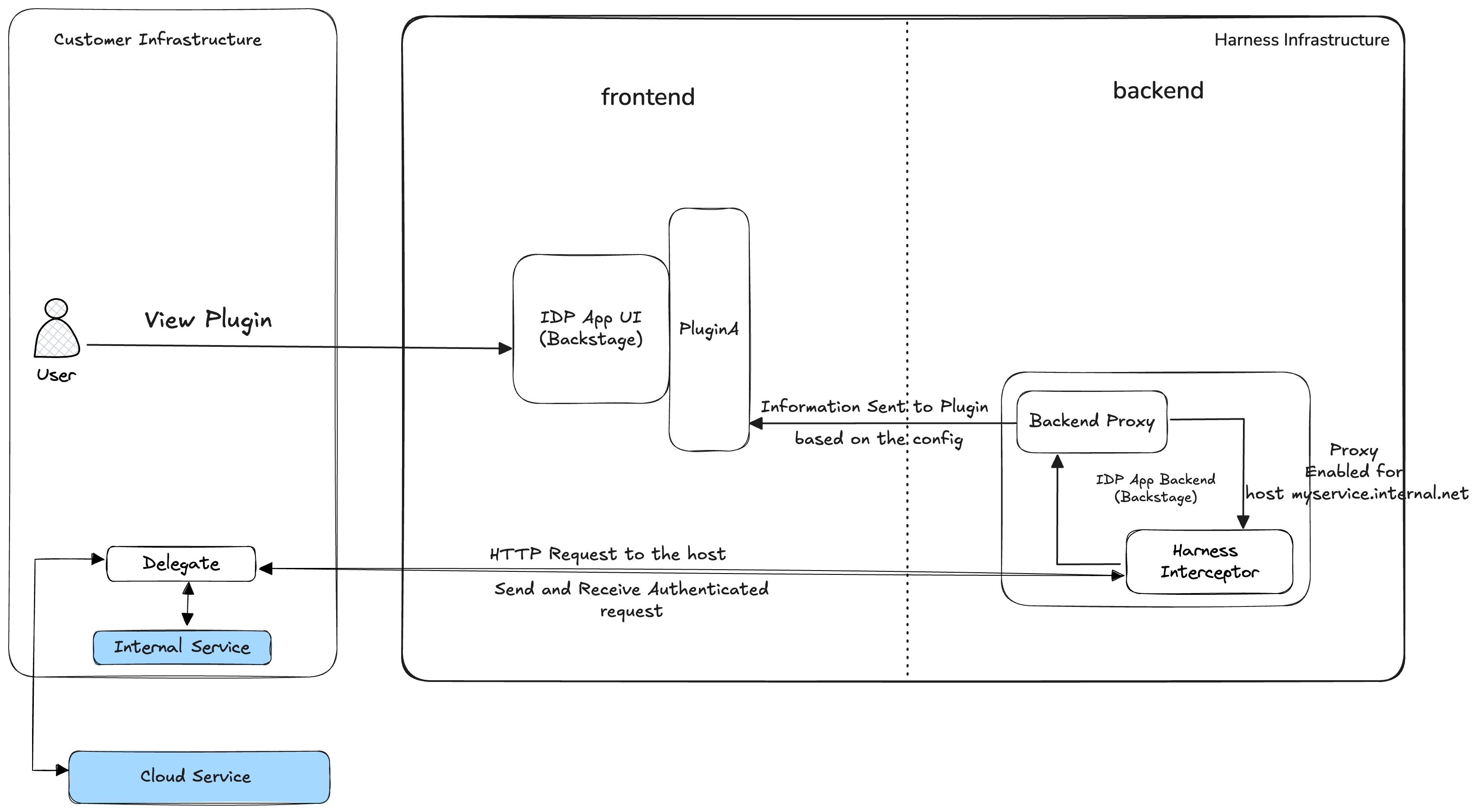 In this case, the plugin connects to an internal system using both Backend Proxy and a Delegate Proxy. The request to delegate proxy goes through an interceptor which checks for the host as it is required by the delegate proxy.