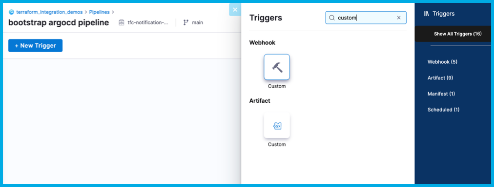For the pipeline to listen for Terraform Cloud events, you must add a custom webhook trigger.