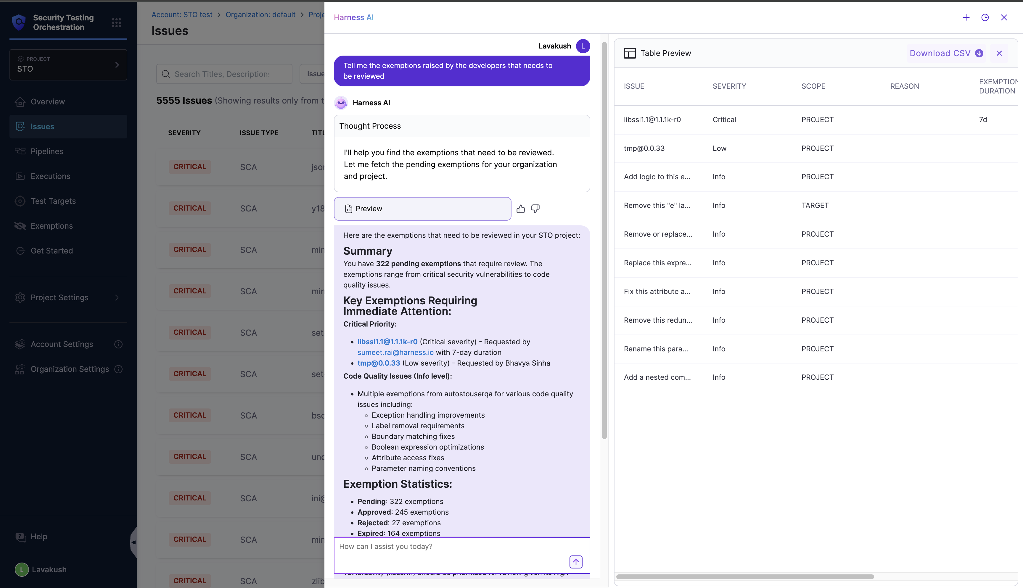 The AppSec Agent in Harness STO lets you explore STO data using natural language. Instead of navigating multiple dashboards or applying several filters, you can ask questions like "List all the issues of type secretin the project".