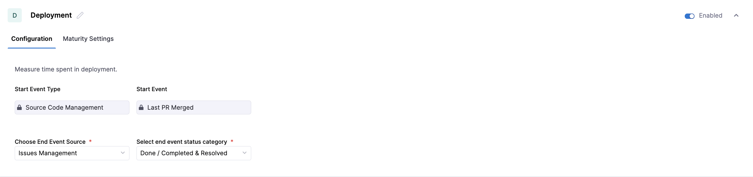| End Event Source | The system where the signal that ends the stage is recorded. This can differ from the start source. | Issue Management or Source Code Management |