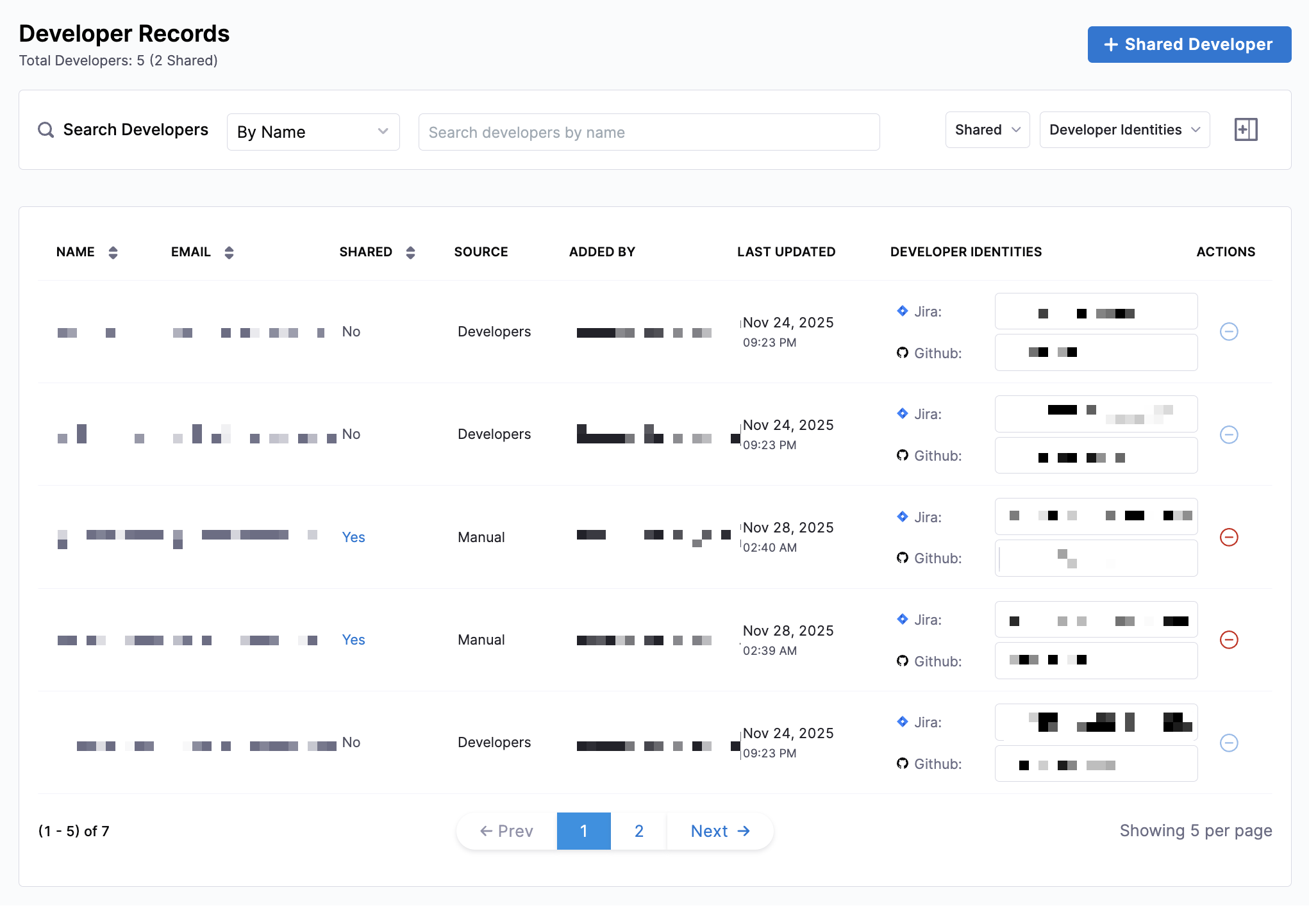 Source: Developers added through the API or CSV upload, appear withSource: Developers. Developers added in the UI appear withSource: Manual.Shared: Developers inherited from the team's Org Tree leaf node appear withShared: No. Developers who are not from this team (or Org Tree node) but are manually added because they contribute to the team's work appear withShared: Yes.