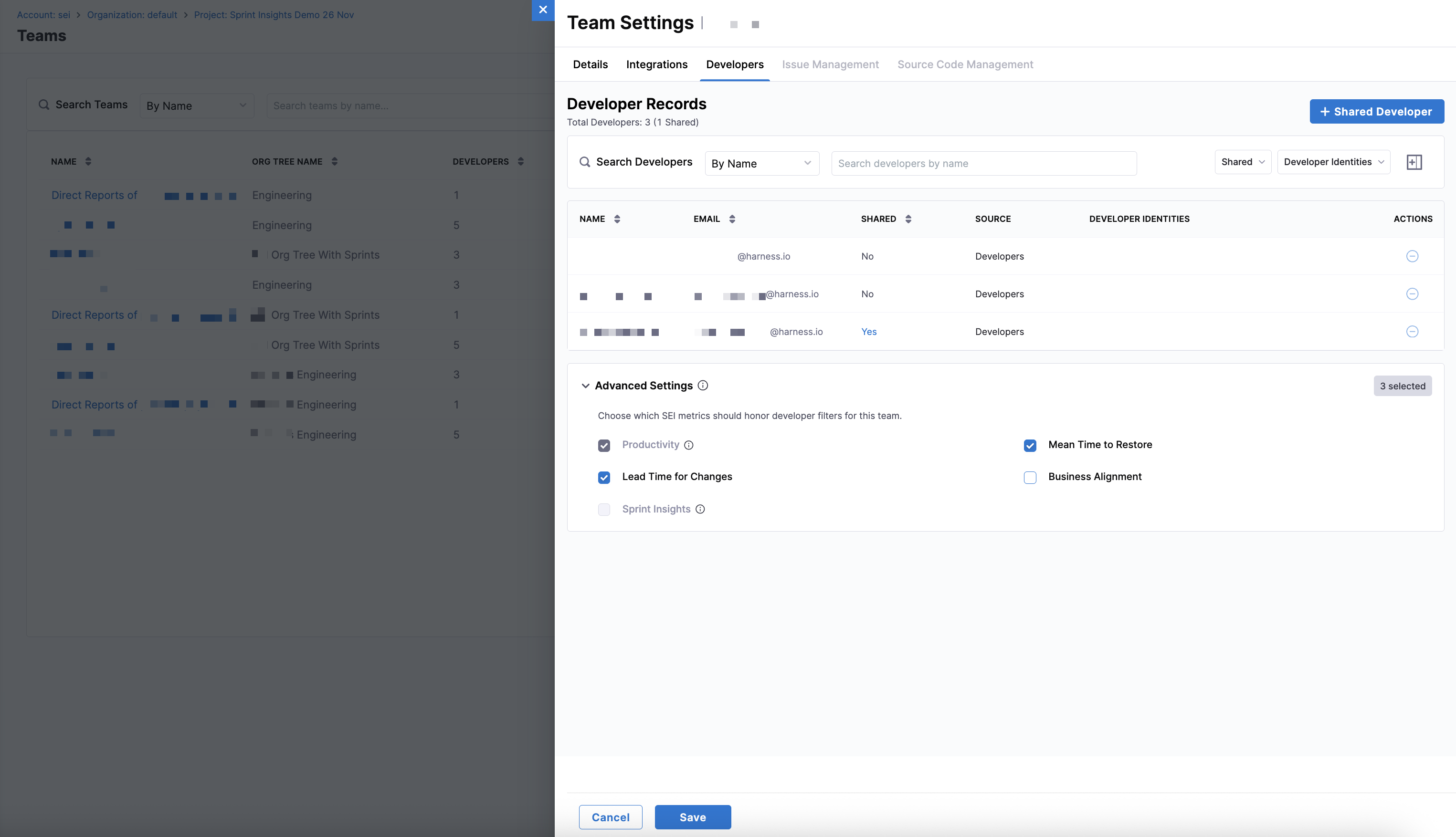 In the Advanced Settings section, select the Harness SEI metrics that should honor developer filters for this team.