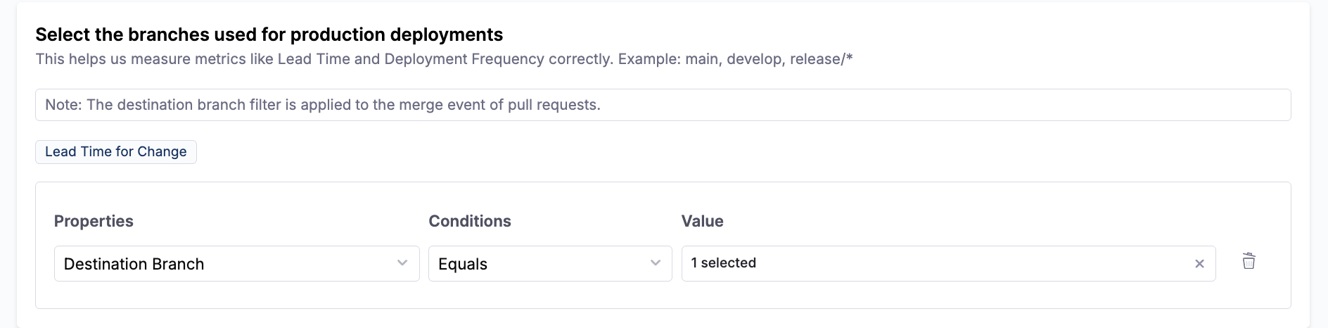 Correctly defining repositories, branches, and deployment-related criteria ensures SEI 2.0 accurately calculates Lead Time for Change and Deployment Frequency, especially when multiple SCM integrations are configured.