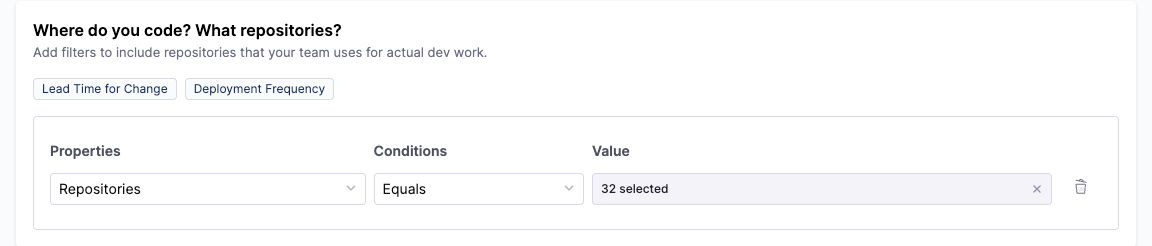 Select only the repositories your team owns or contributes to regularly, for example, use Repositories Equals documentation.