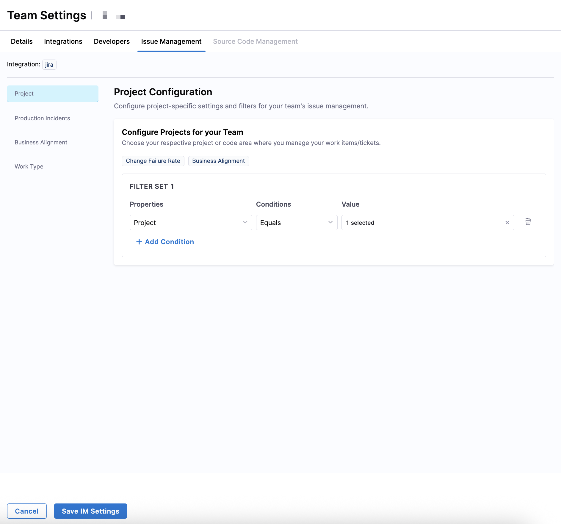 Use the Issue Management tab in Team Settings to define which work items are relevant to your team and how they should be interpreted for metrics calculation. These settings control how SEI 2.0 scopes work, identifies incidents, categorizes investment, and classifies different types of work.