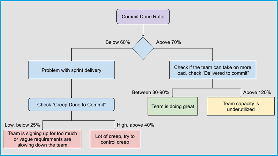 If the average commit done ratio over a long period of time is above 70 percent, then the team is executing sprint plans well and could potentially take on more load. If the total done to commit ratio is above 120 percent, then the sprint plans aren't making full use of the team's capacity.