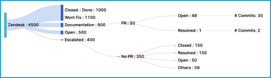 - Escalated tickets with a PR are broken into their final statuses along with the number of associated commits.