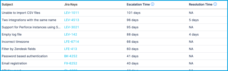 - Support Time Across Stages: Measure efficacy across support and engineering teams by understanding how long issues are open (across support and issue management tools) and how soon issues are acted upon.