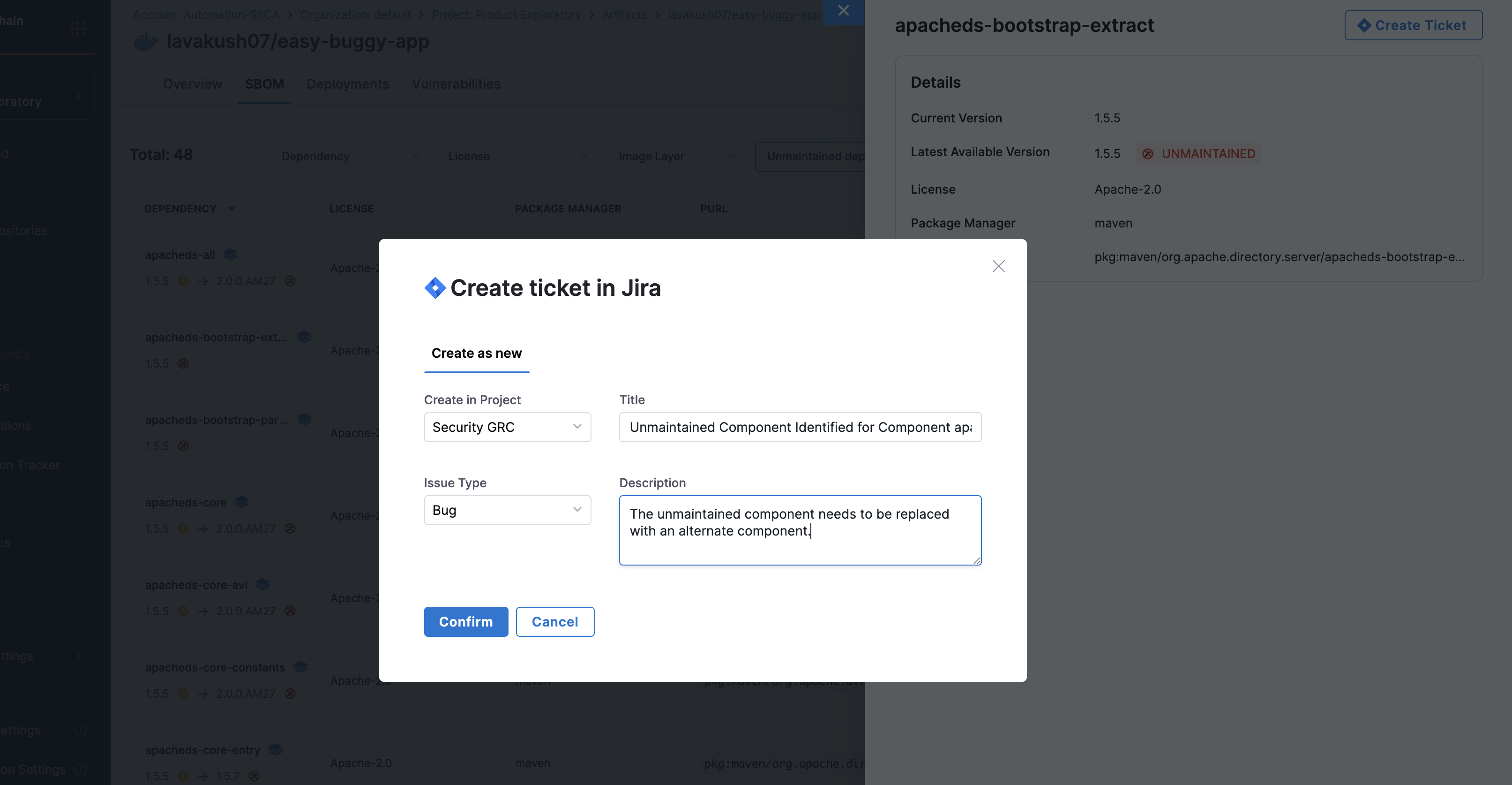 - Select the outdated/unmaintained dependency, close to EOL or EOL components, which will open a side panel. Click on Create Ticket.