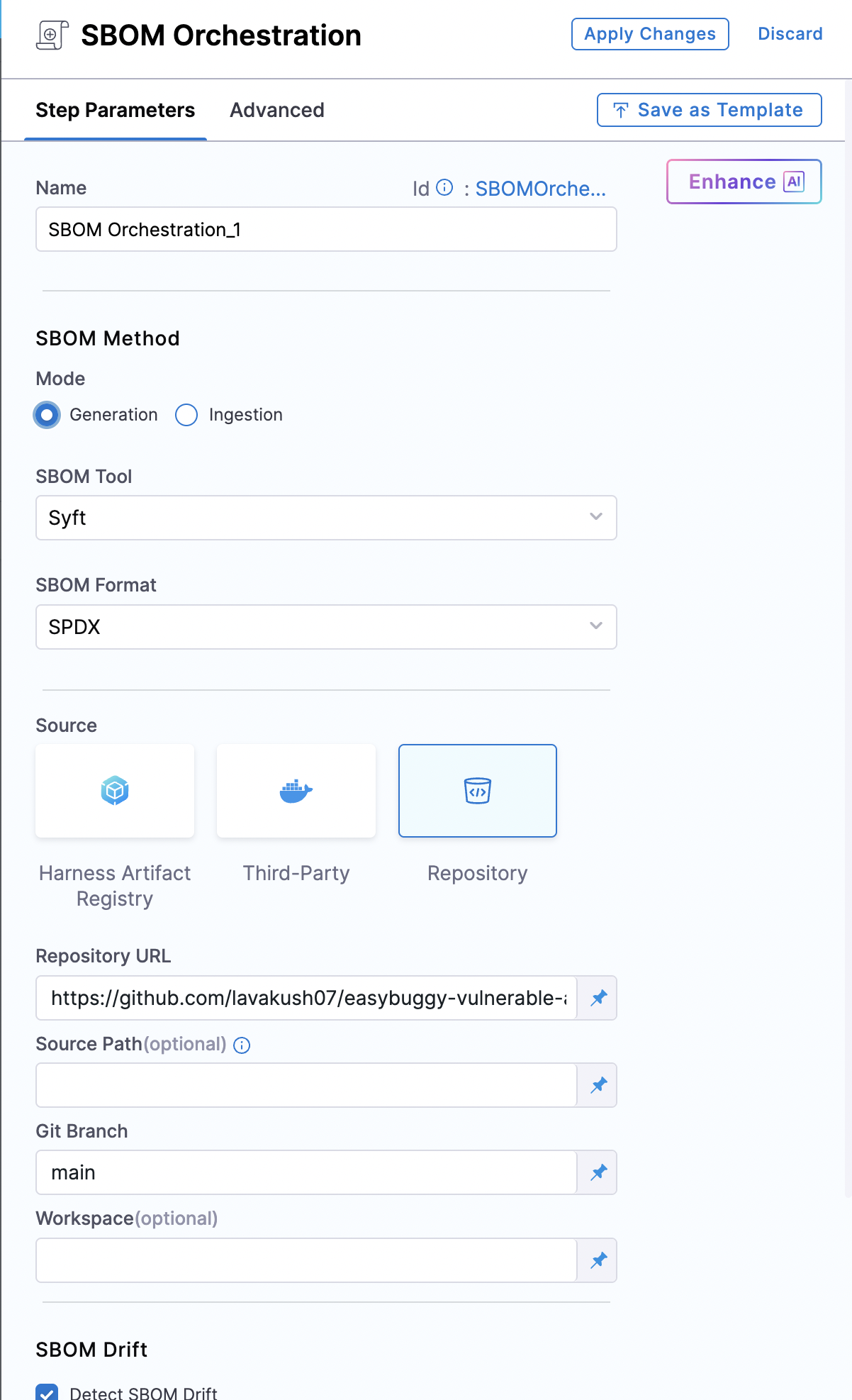 Using SBOM Orchestration step you can generate the SBOM for both Container images and Repositories. Follow the steps to configure the fields for each supported type.