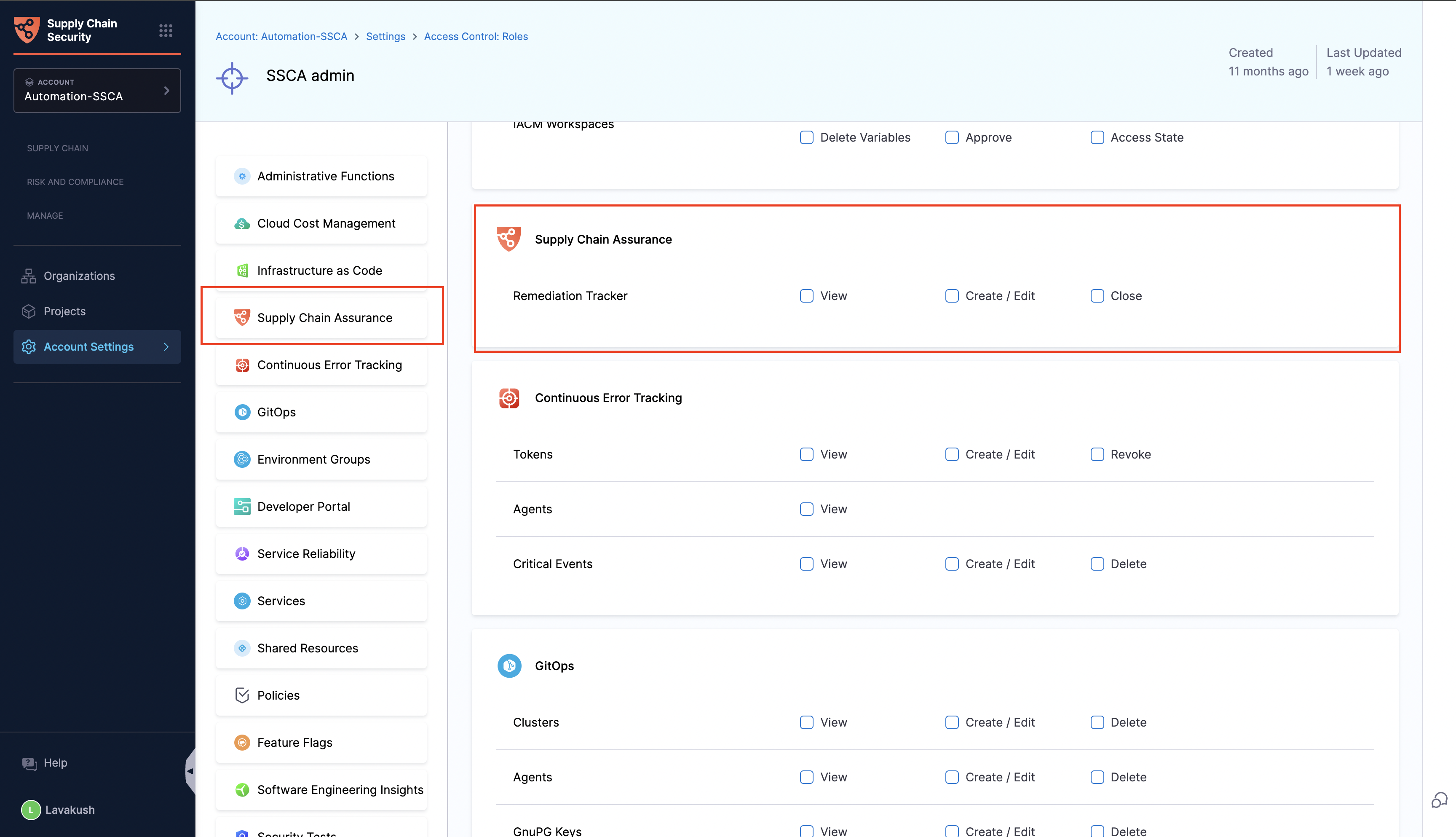 The configuration of RBAC for the Remediation Tracker is possible at three levels: Account, Organization, and Project.